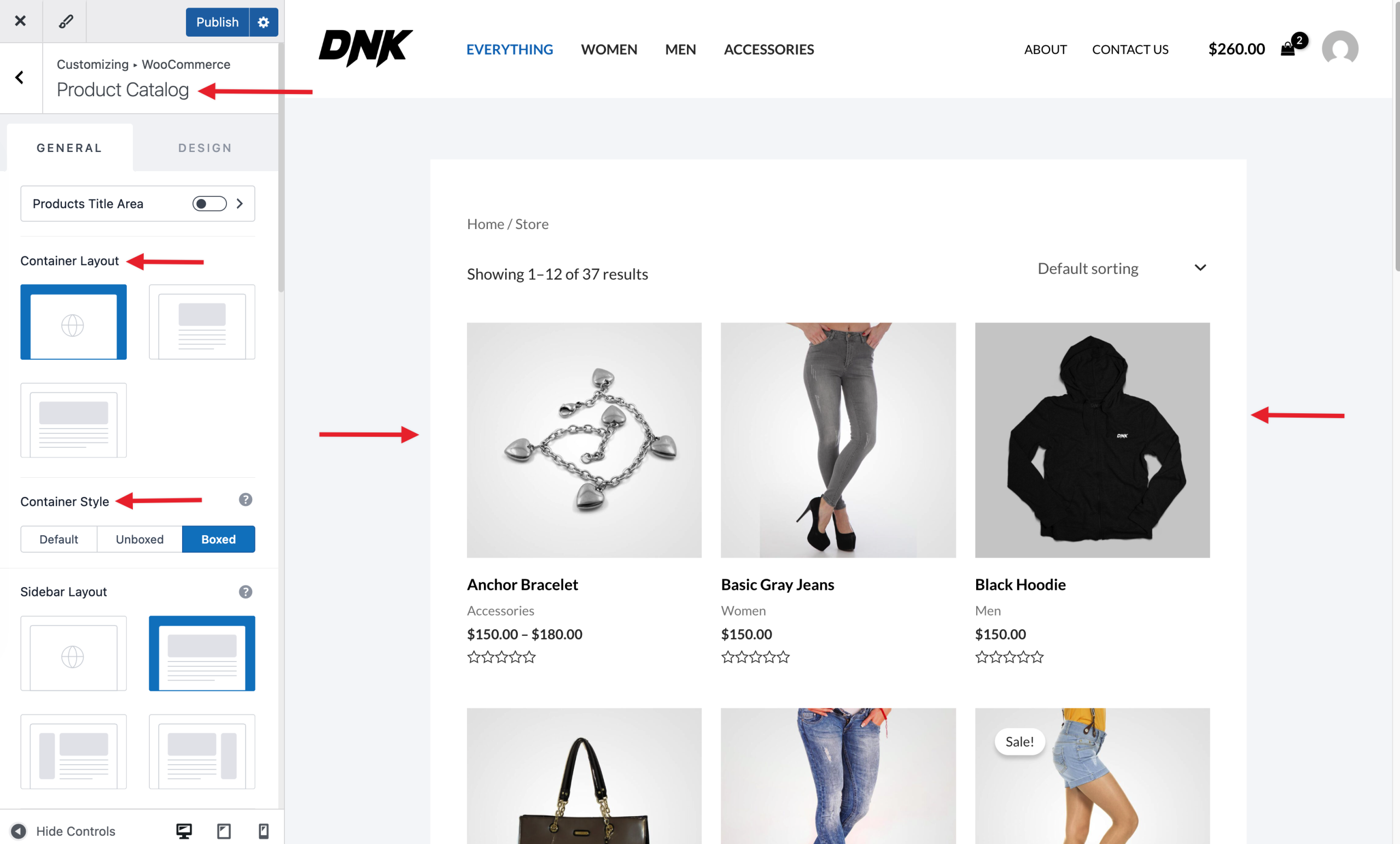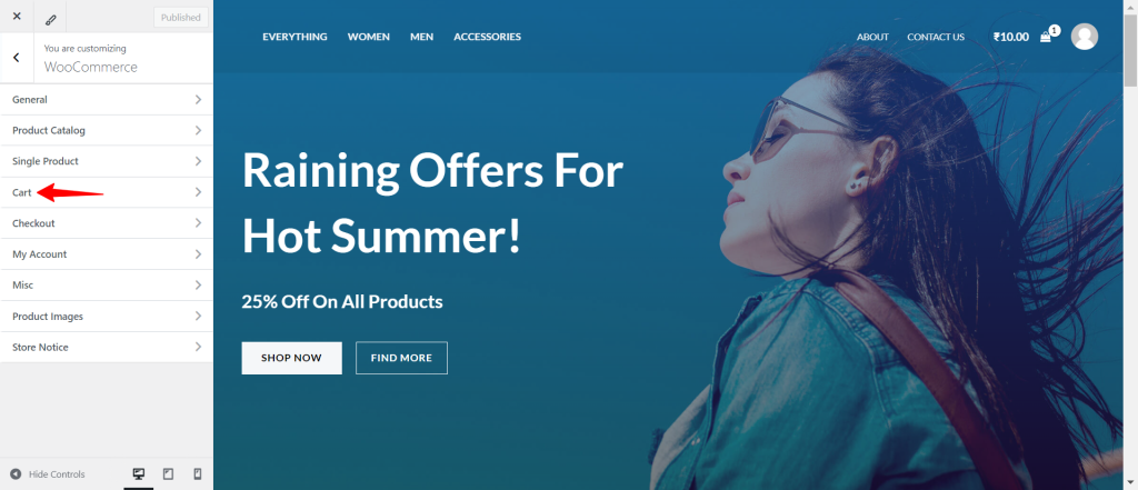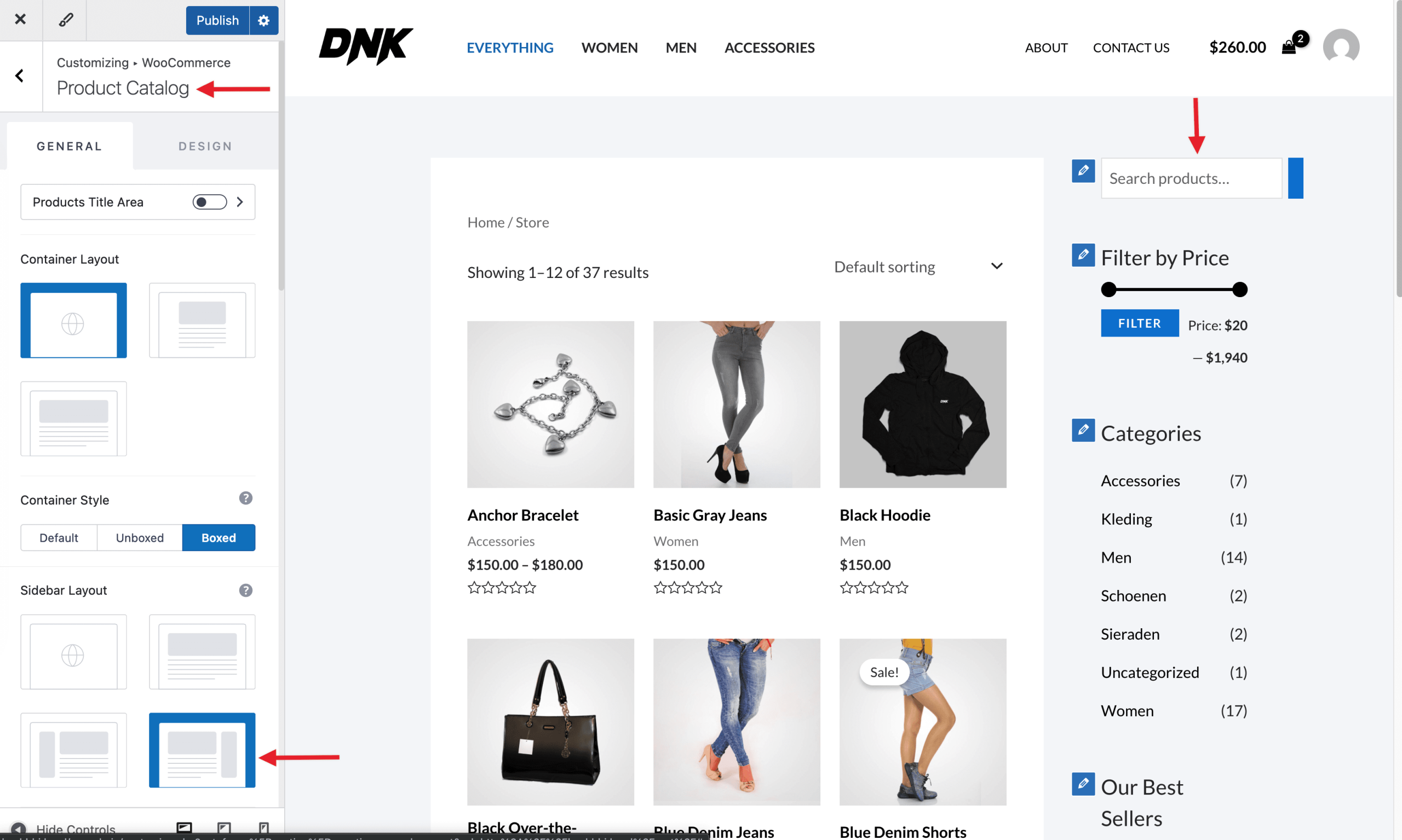 You can control sidebars independently on WooCommerce pages such as Shop, Cart, and Checkout. To set up sidebars, navigate to Appearance > Customize > General > Sidebar.