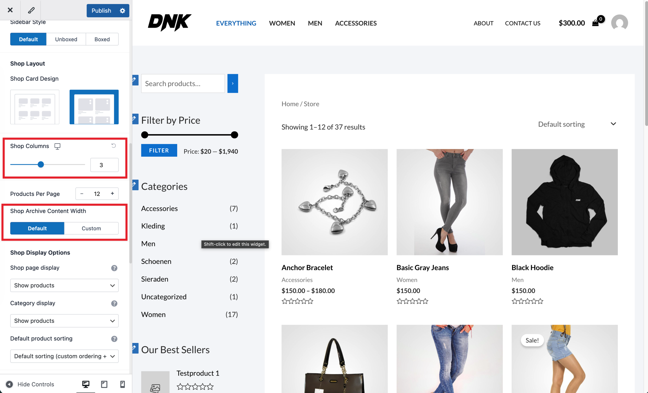 • Shop Archive Content Width: You can choose the default or custom option. If you select the custom setting, you can set the Archive Content Width.