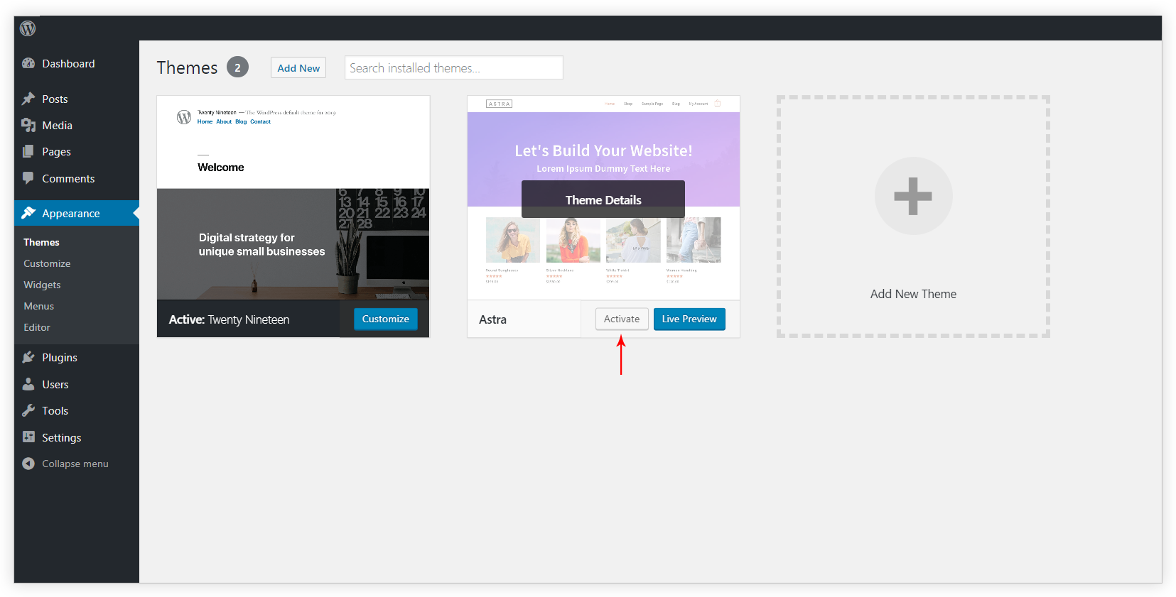 Step 7 – Now the Astra is installed on your site. Go to WordPress Dashboard and activate it from Appearance > Themes