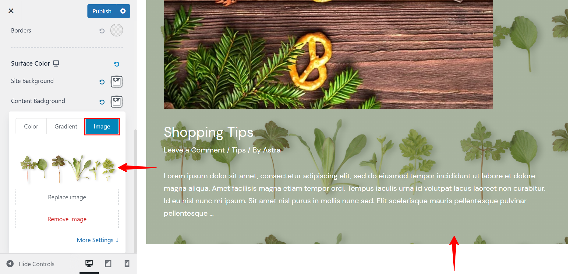• Background (Color and Image) – This color will be applied as a background color to the body on the entire site. If you set both – color and image – make sure to adjust the opacity of the color to make the image visible.