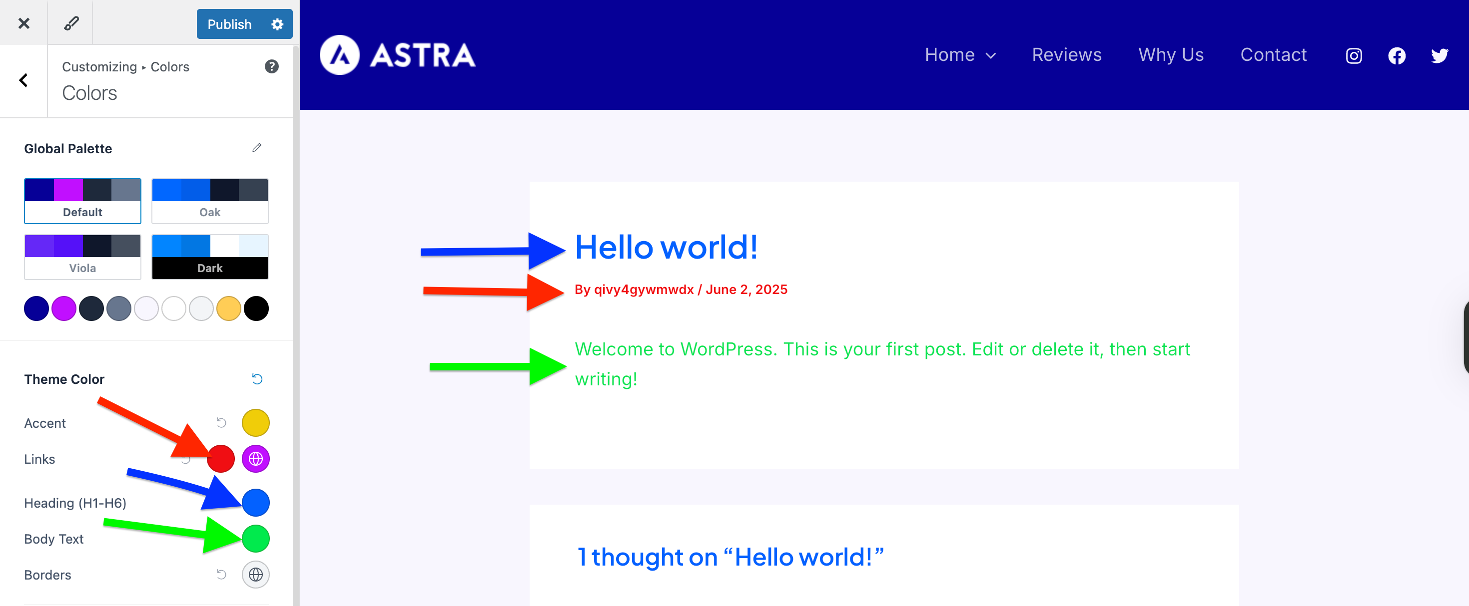 With Astra, you can keep a uniform color scheme on your website with global color options. These colors will be applied to theme sections throughout the website.