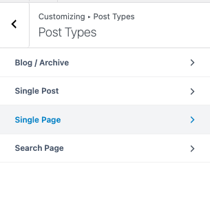 Under the Post Types, you will find the settings for Blog/Archive, Single Post, Search Page, and other post types. For more information, visit the following links.