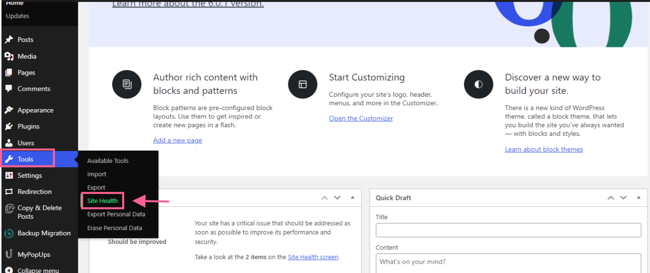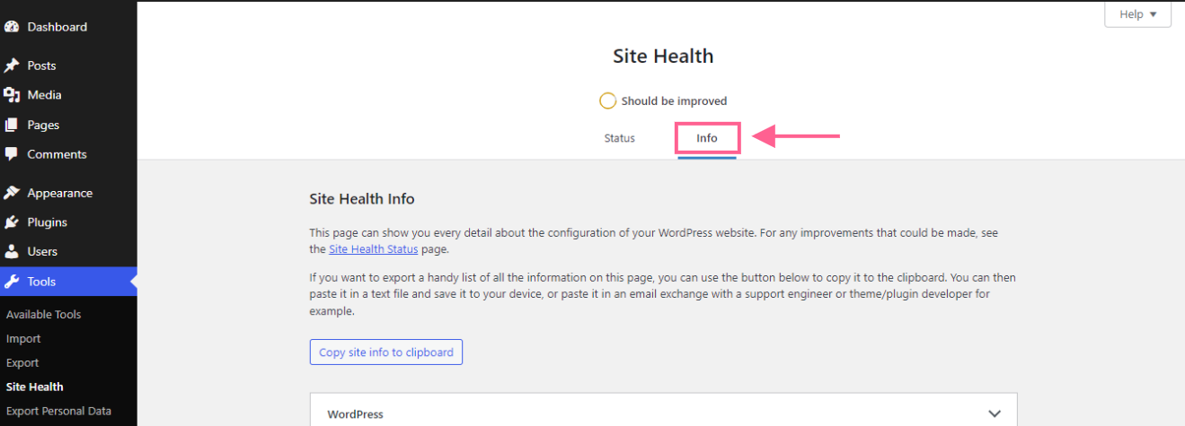 Once you have confirmed that the issue is not related to a plugin or the theme, you will need to check the PHP memory limit of your website. Please navigate to the Tools>Site Health.