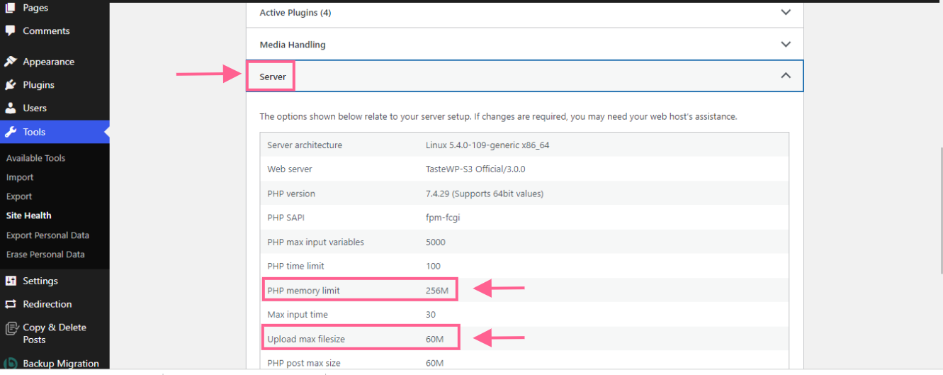 Scroll down to the server option and ensure that the PHP memory limit is set to a minimum of 256M and the upload max file size is set to 60M.