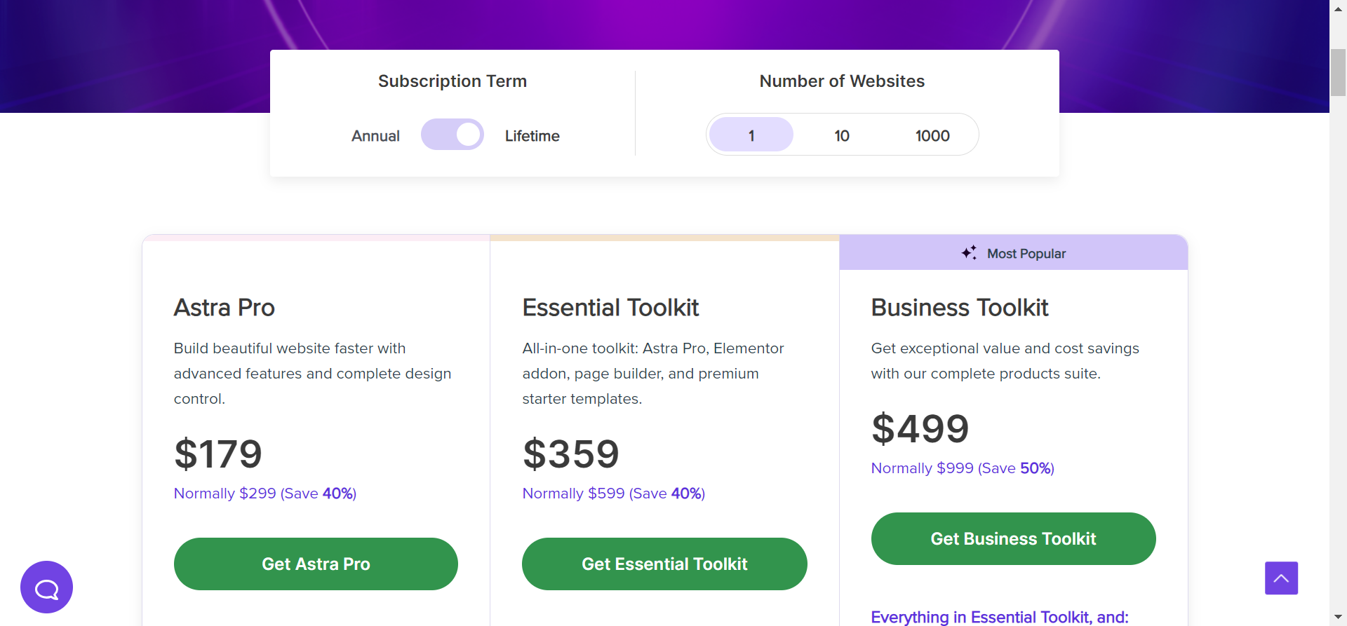Example – If user is considering upgrading from Astra Pro (1000 Sites – Lifetime) priced at $499 to the Business Toolkit (1000 Sites – Lifetime) priced at $1399, user only need to cover the price difference, which is $900 ($1399 – $499).